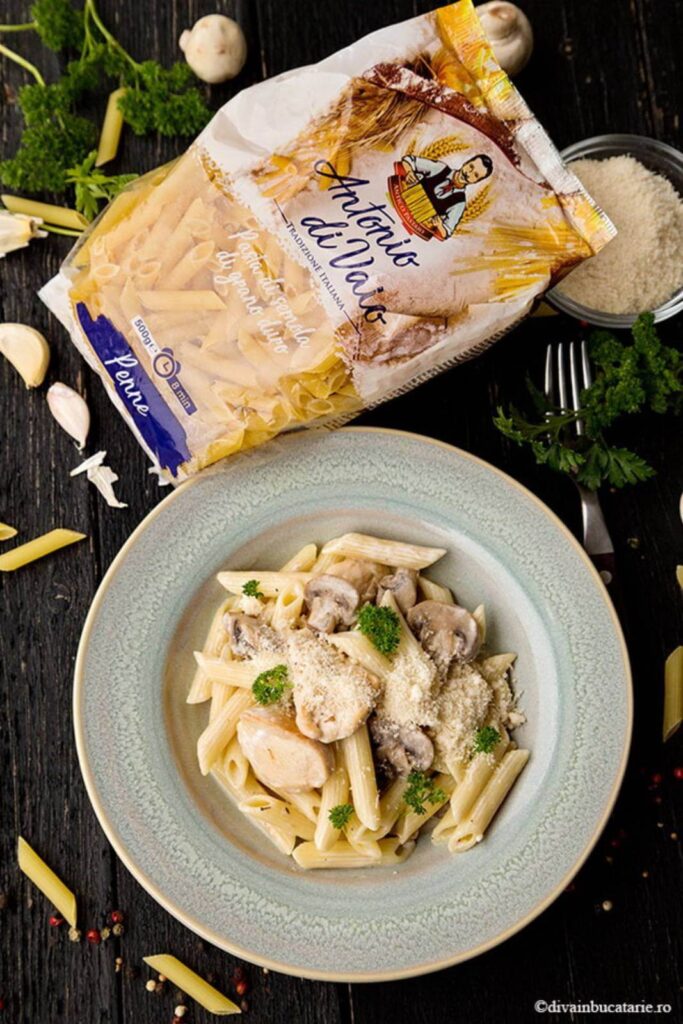 Paste cu pui și ciuperci în sos alb