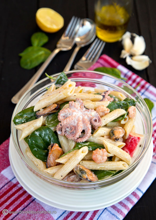 Salată de paste cu fructe de mare și spanac
